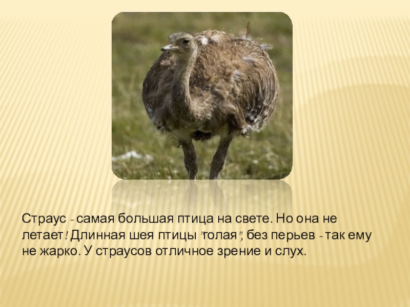 Слайд 7Страус - самая большая птица на свете. Но она не летает!
