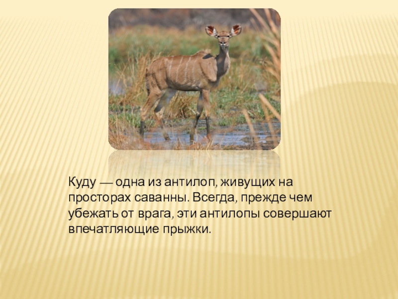 Слайд 8Куду — одна из антилоп, живущих на просторах саванны. Всегда, прежде