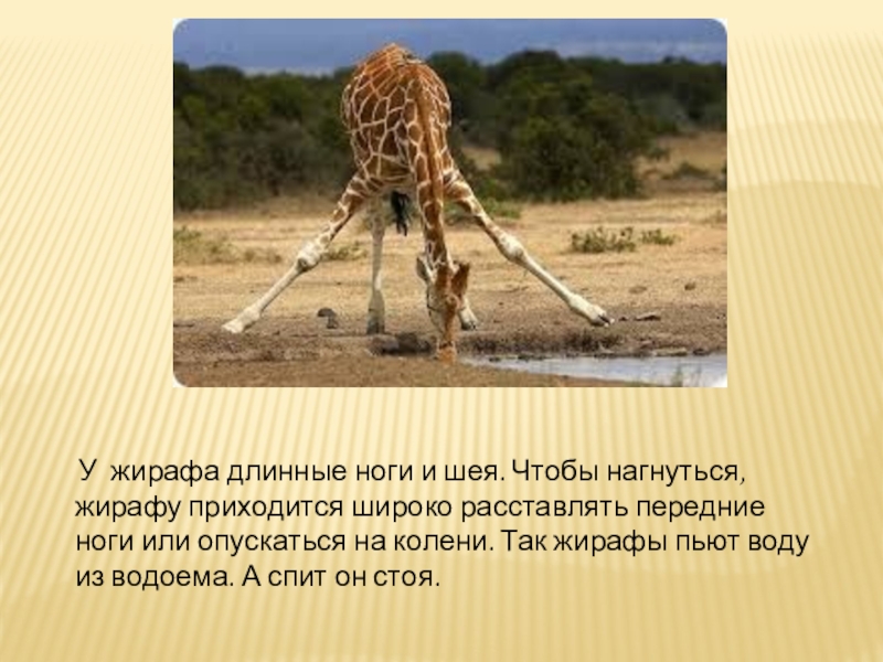 У жирафа длинные ноги и шея. Чтобы нагнуться, жирафу приходится широко расставлять передние ноги или опускаться