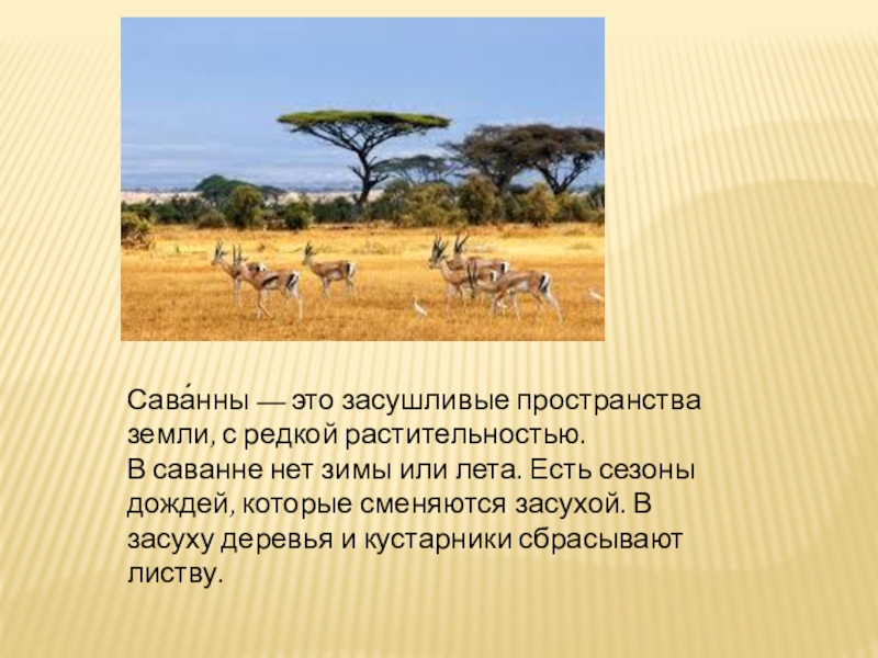 Сава́нны — это засушливые пространства земли, с редкой растительностью. В саванне нет зимы или лета. Есть сезоны