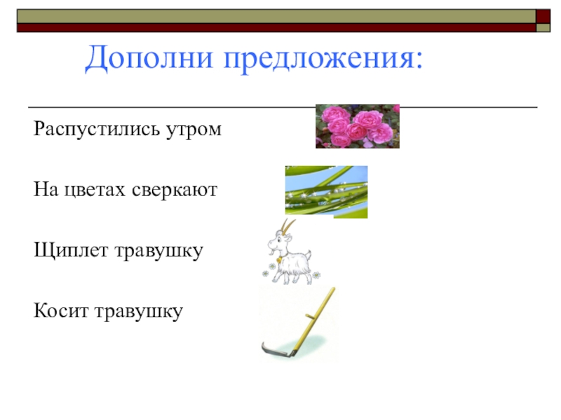 Дополни предложения:Распустились утромНа цветах сверкаютЩиплет травушкуКосит травушку