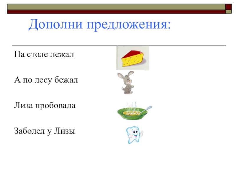 Дополни предложения:На столе лежалА по лесу бежалЛиза пробовалаЗаболел у Лизы