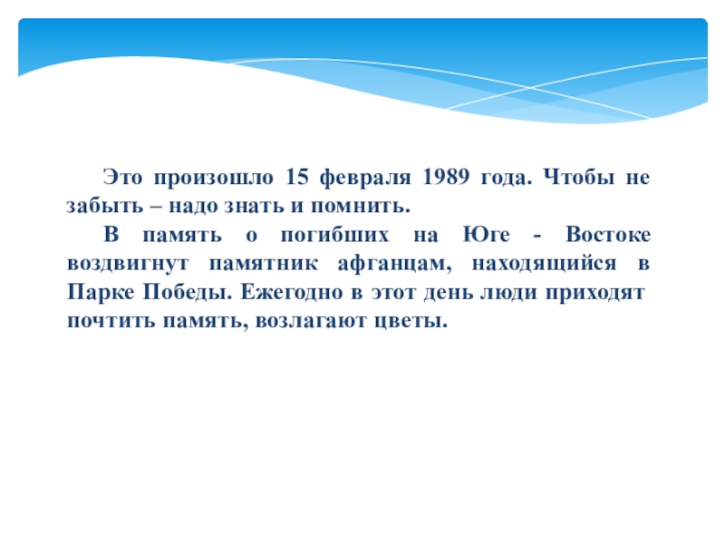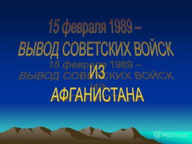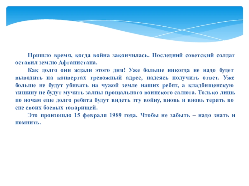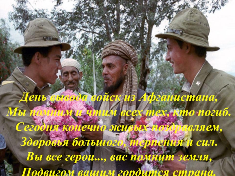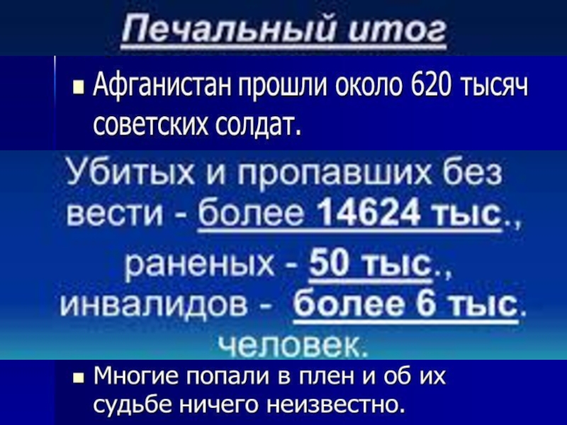 С 25 декабря 1979 года по 15 февраля 1989 года в Афганистане побывало 620 тысяч советских солдат, офицеров, генералов, которые исполняли интернациональный долг, оказывали помощь братскому народу. За это время погибли, умерли от ран, несчастных случаев, исчезли бесследно, не возвратились из плена 14453 человека, 35 тысяч получили ранение.