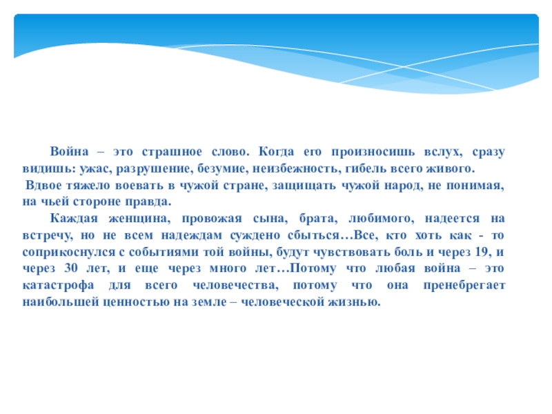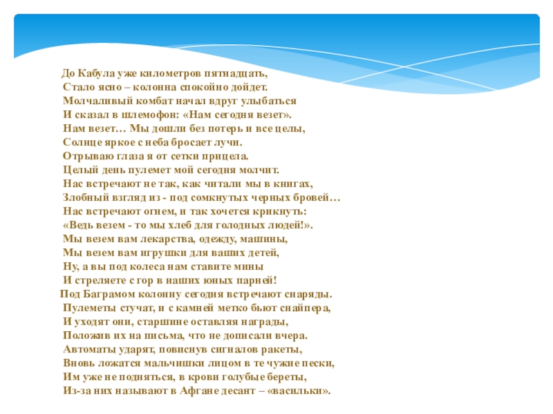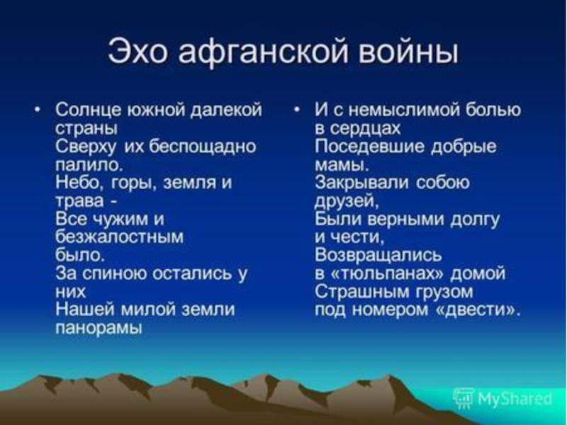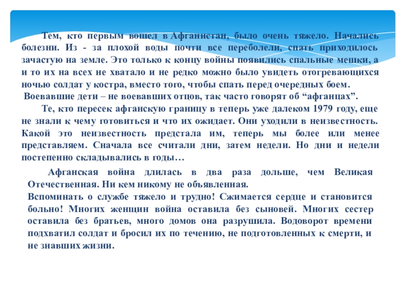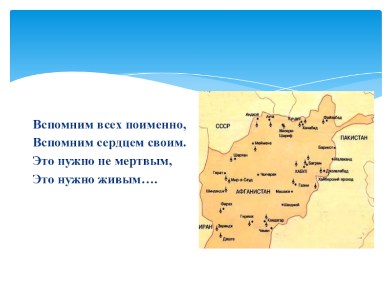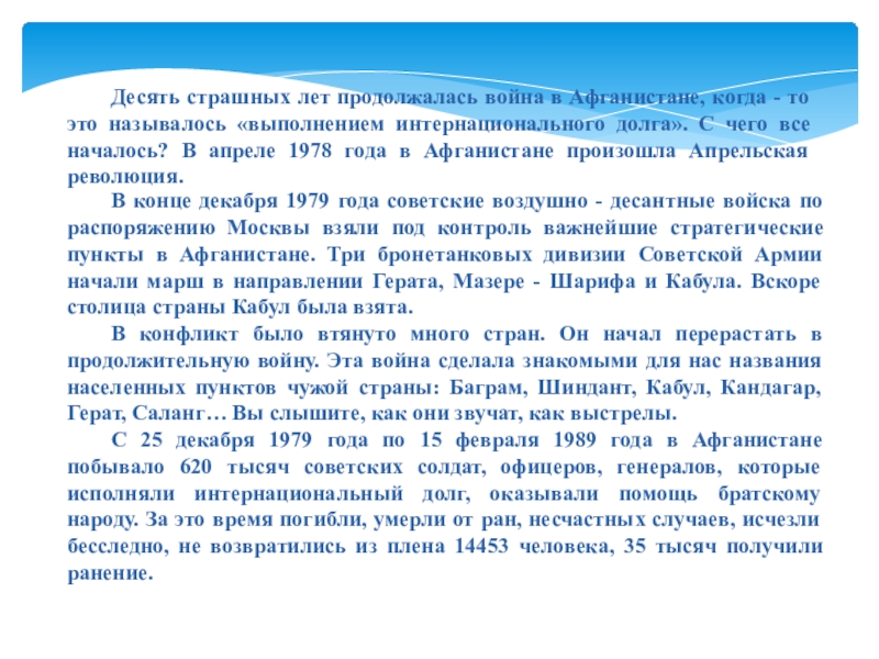 В конфликт было втянуто много стран. Он начал перерастать в продолжительную войну. Эта война сделала знакомыми для нас названия населенных пунктов чужой страны: Баграм, Шиндант, Кабул, Кандагар, Герат, Саланг… Вы слышите, как они звучат, как выстрелы.