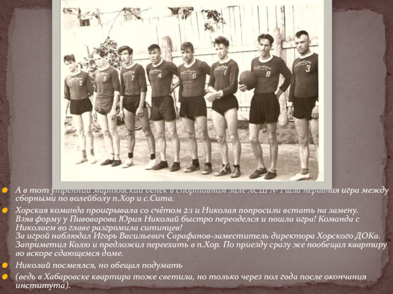 Успешно сдав экзамены, пока ещё не думая о распределении, Николай частенько вспоминал п.Хор, а особенно спортзал, в котором ему посчастливилось сыграть. На тот момент в крае было всего несколько подобных залов и один из них находился в ХСШ № 1.