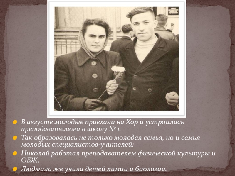 Слайд 8В августе молодые приехали на Хор и устроились преподавателями в школу