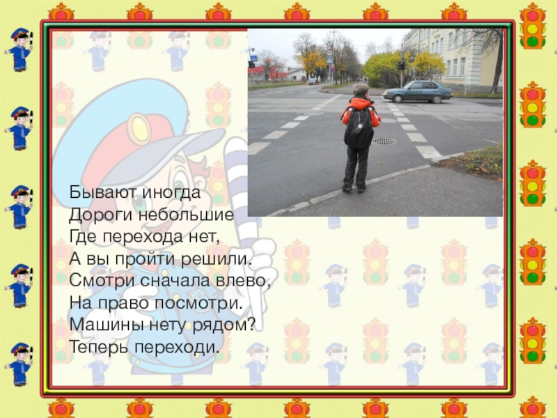 Бывают иногда Дороги небольшие Где перехода нет, А вы пройти решили. Смотри сначала влево, На право