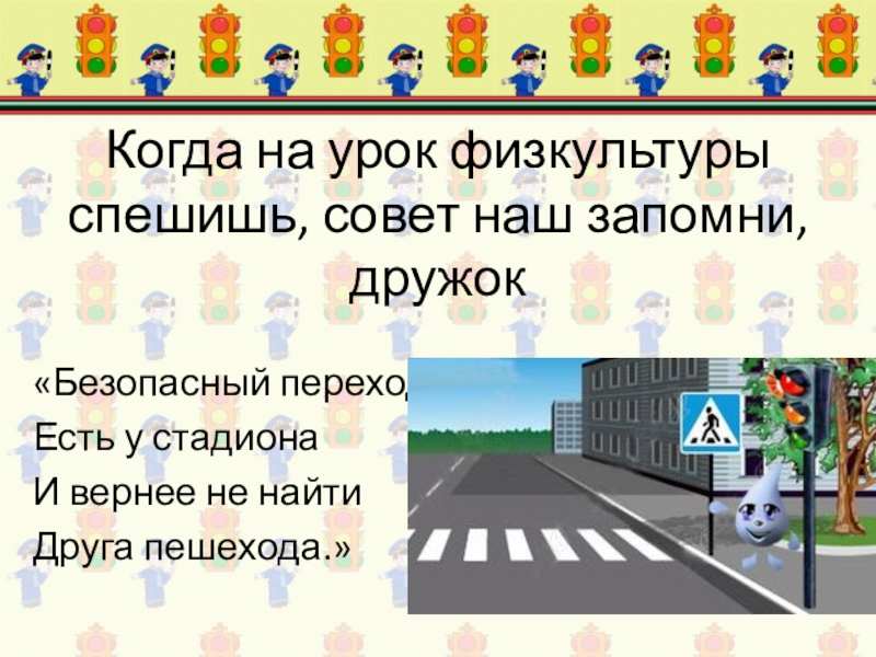 Когда на урок физкультуры спешишь, совет наш запомни, дружок «Безопасный переходЕсть у стадионаИ вернее не
