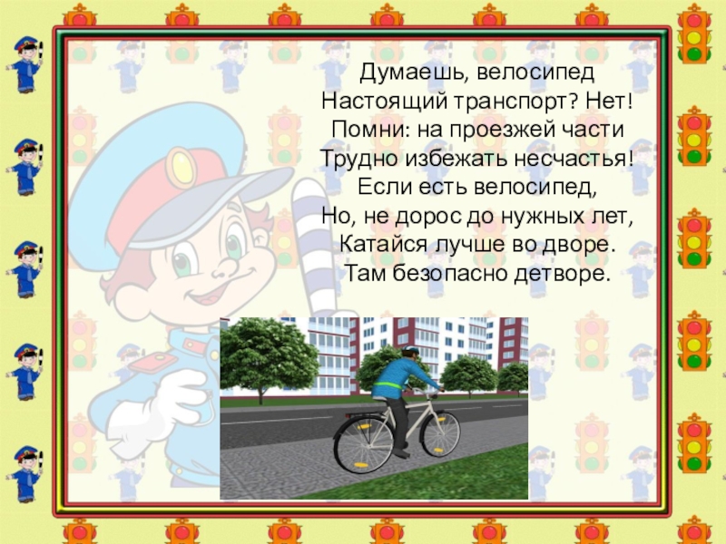 Слайд 7Думаешь, велосипед Настоящий транспорт? Нет! Помни: на проезжей части Трудно избежать несчастья! Если есть велосипед, Но,