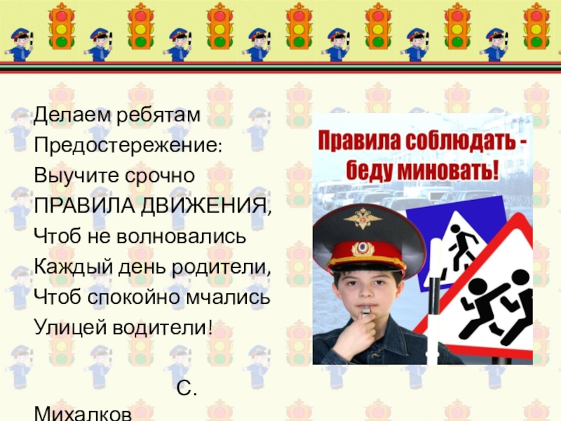 Делаем ребятам Предостережение: Выучите срочно ПРАВИЛА ДВИЖЕНИЯ, Чтоб не волновались Каждый день родители, Чтоб спокойно мчались Улицей водители!