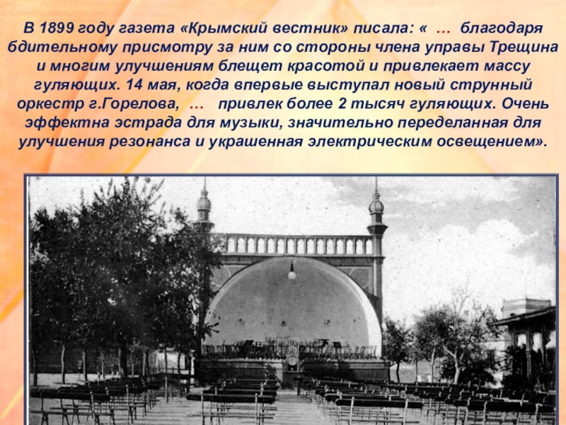 присмотру за ним со стороны члена управы Трещина и многим улучшениям блещет красотой и привлекает массу гуляющих. 14 мая, когда впервые выступал новый струнный оркестр г.Горелова, … привлек более 2 тысяч гуляющих. Очень эффектна эстрада для музыки, значительно переделанная для улучшения резонанса и украшенная электрическим освещением».