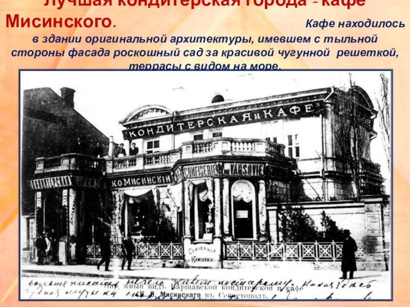 Кафе находилось в здании оригинальной архитектуры, имевшем с тыльной стороны фасада роскошный сад за красивой чугунной решеткой, террасы с видом на море.