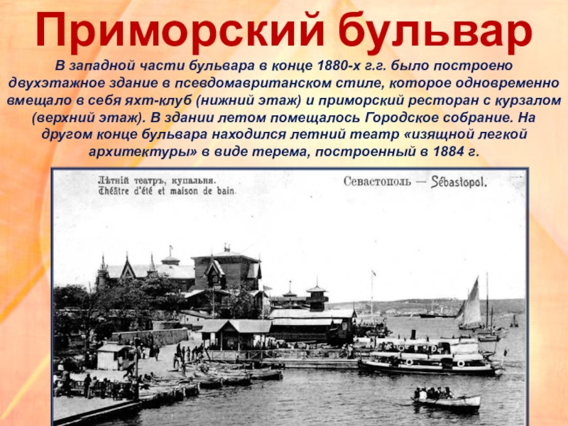 двухэтажное здание в псевдомавританском стиле, которое одновременно вмещало в себя яхт-клуб (нижний этаж) и приморский ресторан с курзалом (верхний этаж). В здании летом помещалось Городское собрание. На другом конце бульвара находился летний театр «изящной легкой архитектуры» в виде терема, построенный в 1884 г.