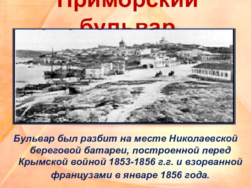 Бульвар был разбит на месте Николаевской береговой батареи, построенной перед