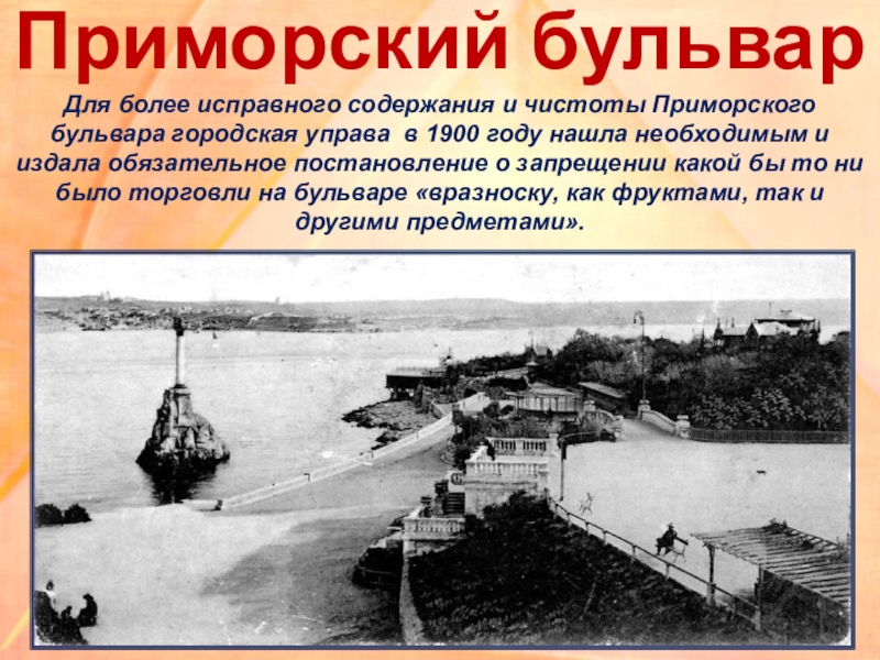 в 1900 году нашла необходимым и издала обязательное постановление о запрещении какой бы то ни было торговли на бульваре «вразноску, как фруктами, так и другими предметами».