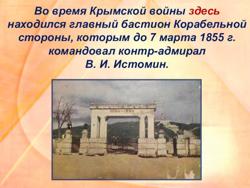 Слайд 38Во время Крымской войны здесь находился главный бастион Корабельной стороны, которым