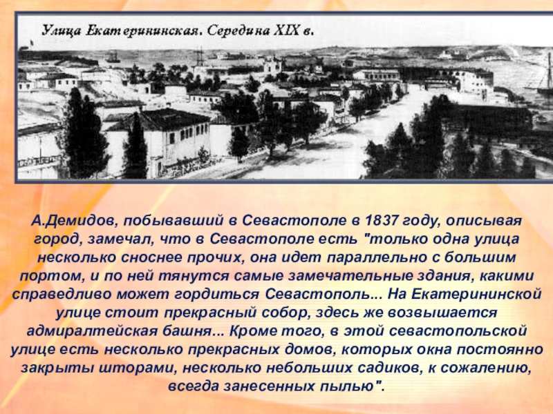 в Севастополе есть "только одна улица несколько сноснее прочих, она идет параллельно с большим портом, и по ней тянутся самые замечательные здания, какими справедливо может гордиться Севастополь... На Екатерининской улице стоит прекрасный собор, здесь же возвышается адмиралтейская башня... Кроме того, в этой севастопольской улице есть несколько прекрасных домов, которых окна постоянно закрыты шторами, несколько небольших садиков, к сожалению, всегда занесенных пылью".