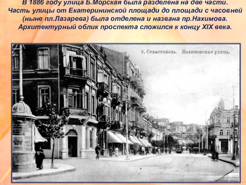 Часть улицы от Екатерининской площади до площади с часовней (ныне пл.Лазарева) была отделена и названа пр.Нахимова. Архитектурный облик проспекта сложился к концу XIX века.