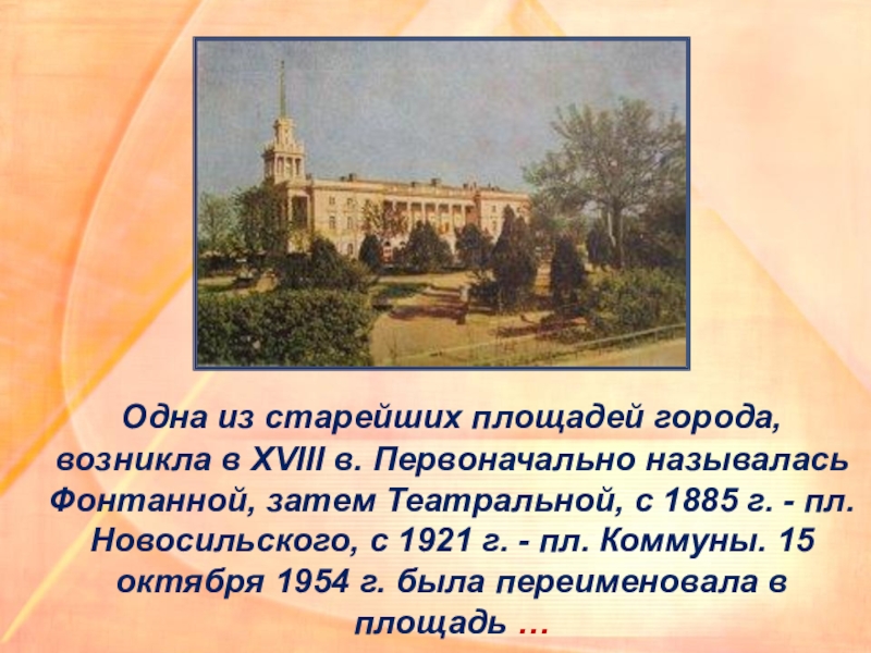 Первоначально называлась Фонтанной, затем Театральной, с 1885 г. - пл. Новосильского, с 1921 г. - пл. Коммуны. 15 октября 1954 г. была переименовала в площадь …