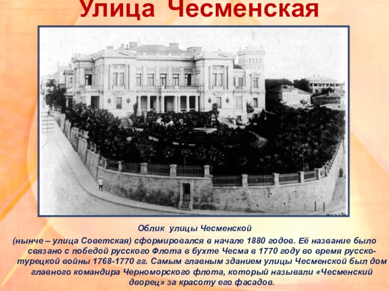 1880 годов. Её название было связано с победой русского Флота в бухте Чесма в 1770 году во время русско-турецкой войны 1768-1770 гг. Самым главным зданием улицы Чесменской был дом главного командира Черноморского флота, который называли «Чесменский дворец» за красоту его фасадов.