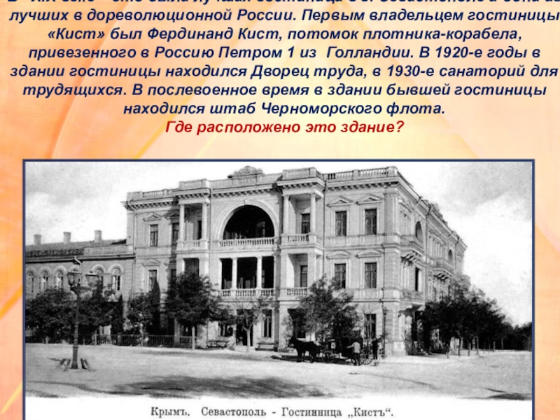 и одна из лучших в дореволюционной России. Первым владельцем гостиницы «Кист» был Фердинанд Кист, потомок плотника-корабела, привезенного в Россию Петром 1 из Голландии. В 1920-е годы в здании гостиницы находился Дворец труда, в 1930-е санаторий для трудящихся. В послевоенное время в здании бывшей гостиницы находился штаб Черноморского флота.
