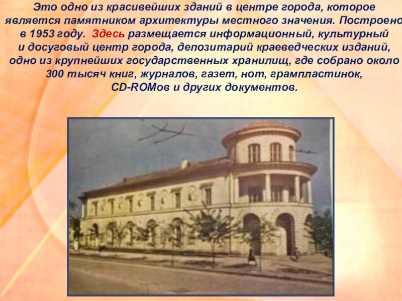 значения. Построено в 1953 году. Здесь размещается информационный, культурный и досуговый центр города, депозитарий краеведческих изданий, одно из крупнейших государственных хранилищ, где собрано около 300 тысяч книг, журналов, газет, нот, грампластинок,