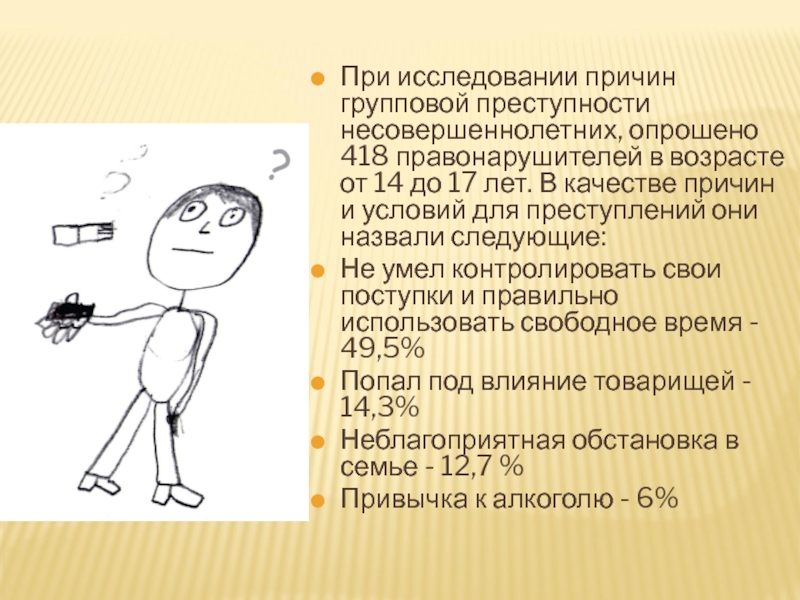 Слайд 4При исследовании причин групповой преступности несовершеннолетних, опрошено 418 правонарушителей в возрасте