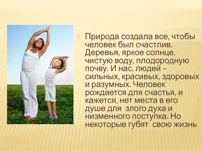 Природа создала все, чтобы человек был счастлив. Деревья, яркое солнце, чистую воду, плодородную почву. И нас, людей – сильных, красивых, здоровых и разумных. Человек рождается для счастья, и кажется, нет места в его душе для злого