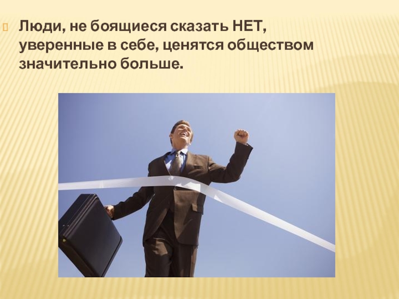 Слайд 7Люди, не боящиеся сказать НЕТ, уверенные в себе, ценятся обществом значительно