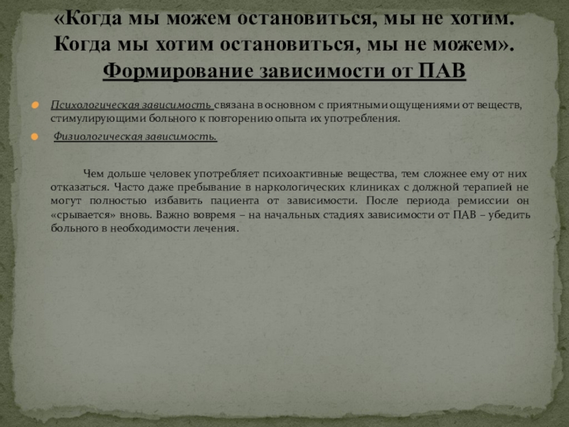 «Когда мы можем остановиться, мы не хотим. Когда мы хотим остановиться, мы не можем». Формирование зависимости от ПАВ