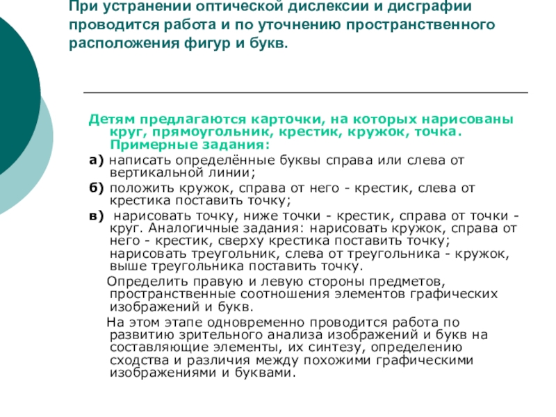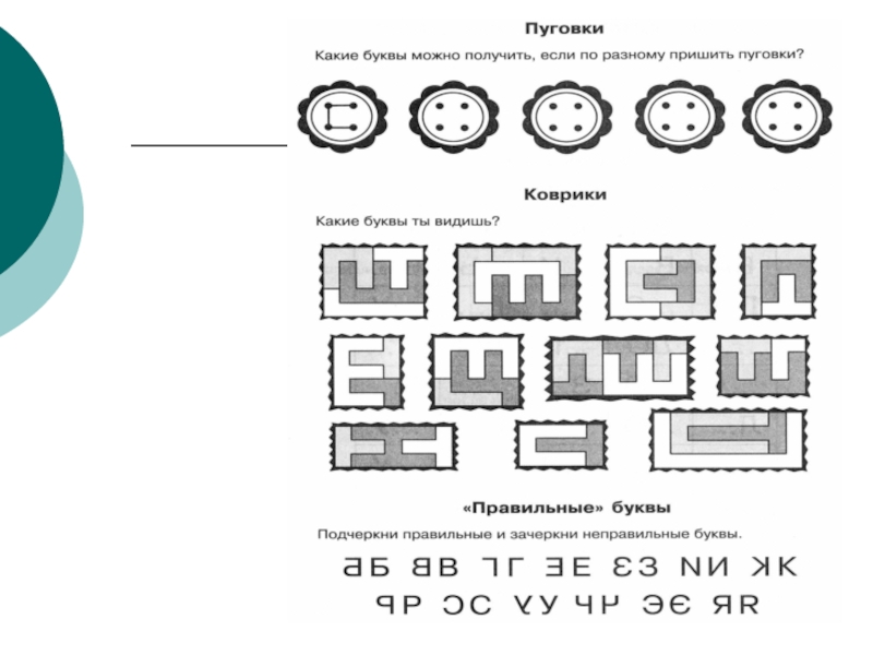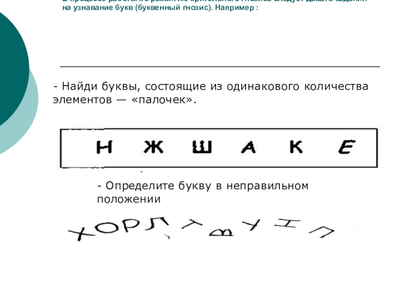 На этом этапе одновременно проводится работа по развитию зрительного анализа изображений и букв на составляющие элементы, их синтезу, определению сходства и различия между похожими графическими изображениями и буквами.