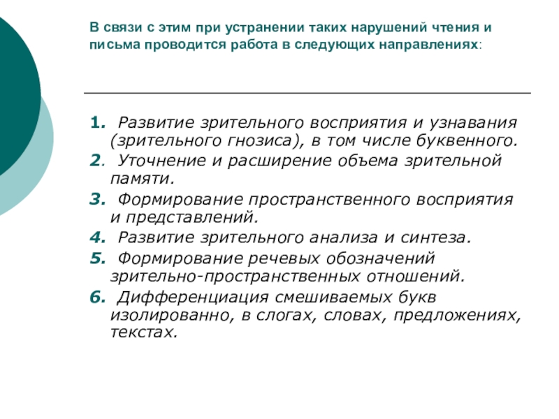 1. Развитие зрительного восприятия и узнавания (зрительного гнозиса), в том числе буквенного.