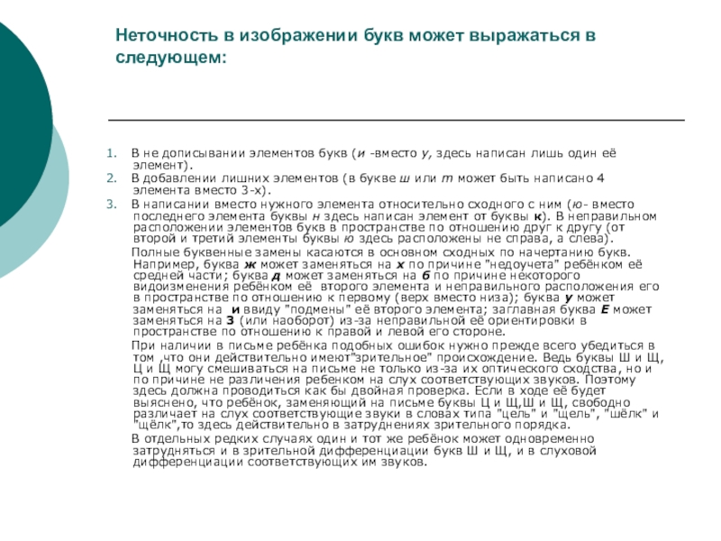 1. Замены графически сходных букв, состоящих из одинаковых элементов, но отличающихся количеством данных элементов (л — м, и — ш, ш — щ,, ц,— щ);