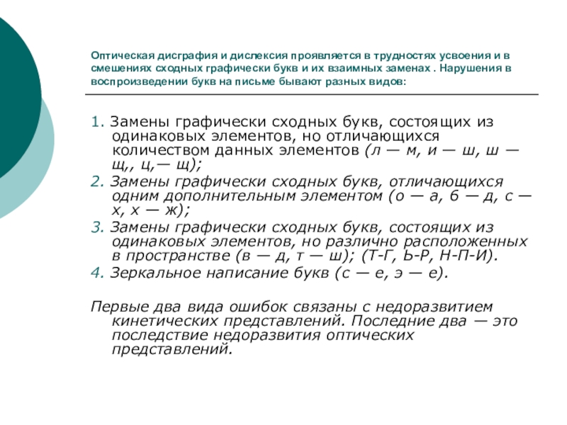 Первые два вида ошибок связаны с недоразвитием кинетических представлений. Последние два — это последствие недоразвития оптических представлений.