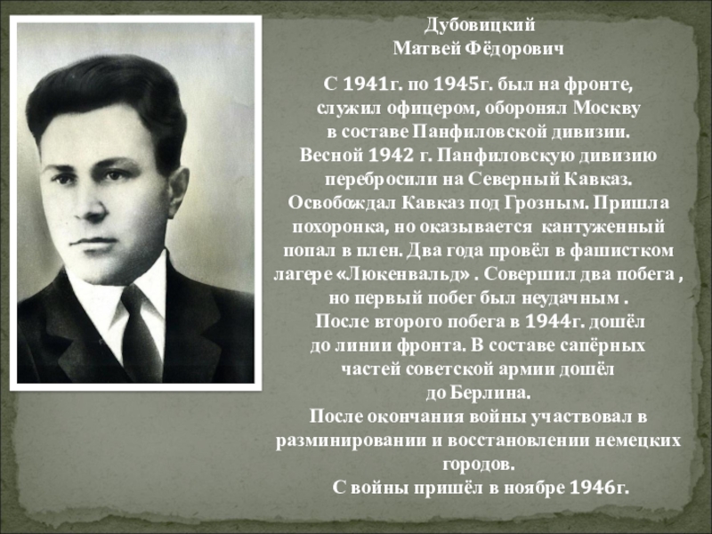 был шофером в рядах Красной Армии. Возил продовольствие в осажденный Ленинград по «дороге жизни» по Ладожскому озеру. Погиб в бою в 1944 году, проявив геройство и мужество. Похоронен с воинскими почестями в городе Вознесенье Ленинградской области. Имеются награды.