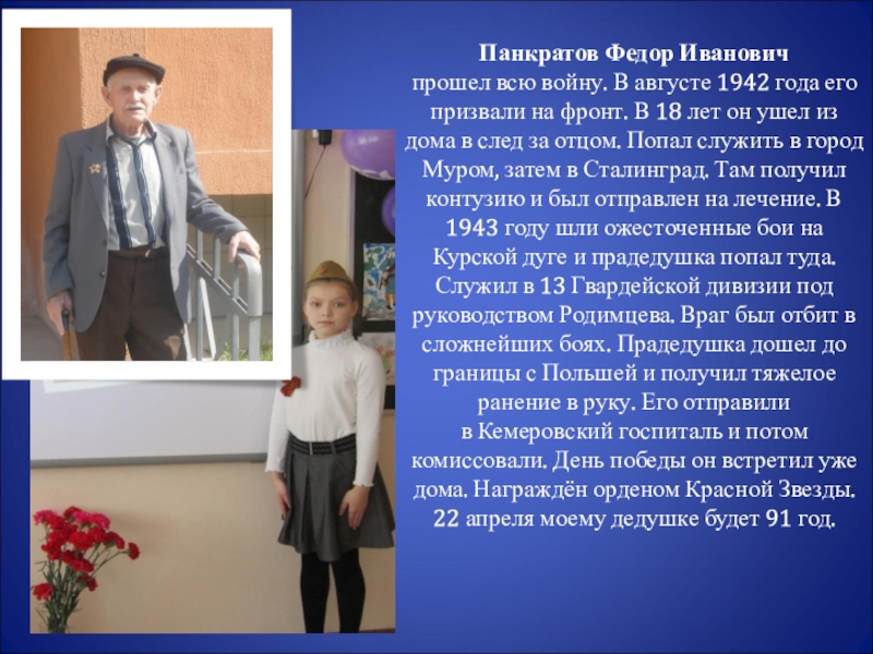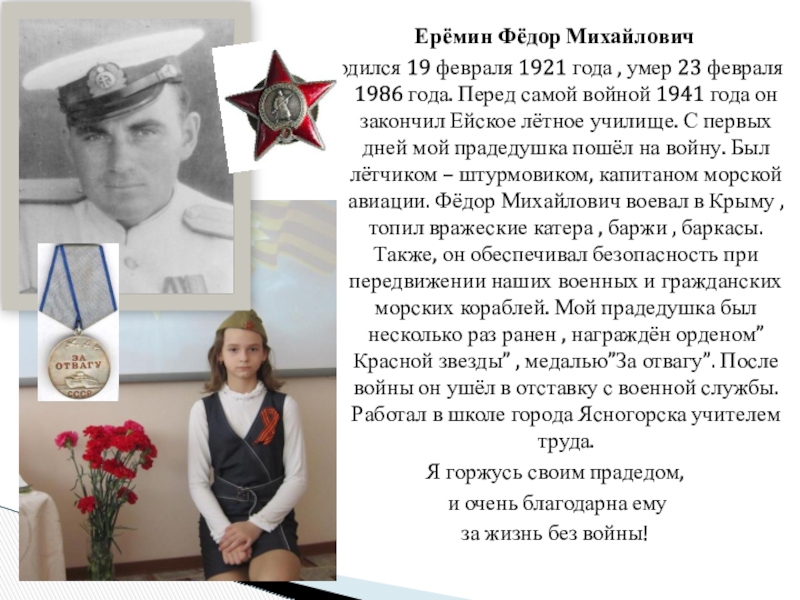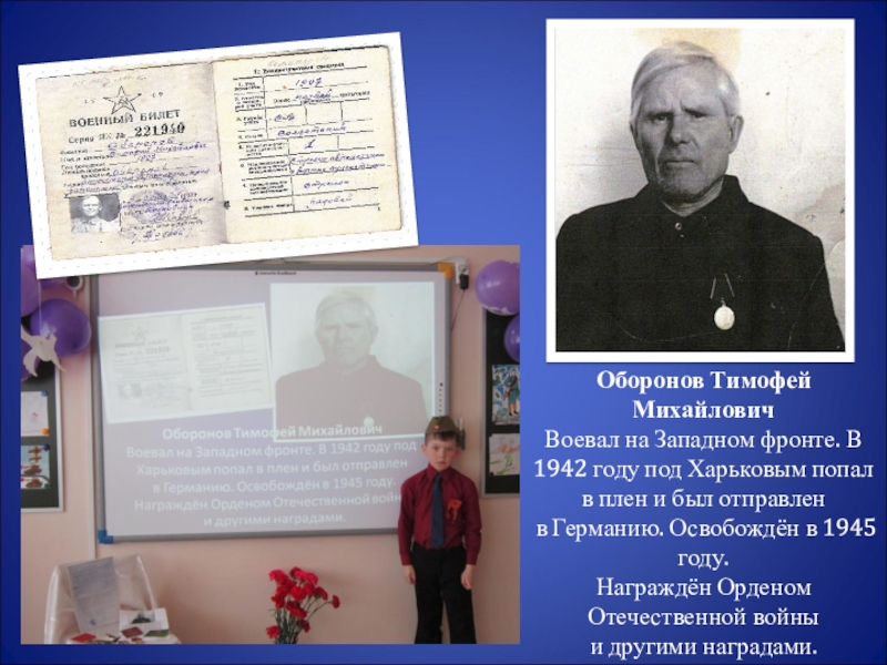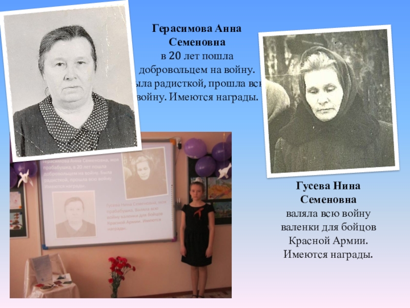 валяла всю войну валенки для бойцов Красной Армии. Имеются награды.