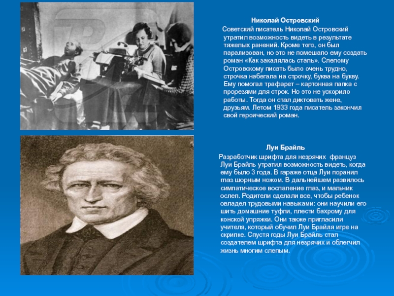 Советский писатель Николай Островский утратил возможность видеть в результате тяжелых ранений. Кроме того, он был парализован, но это не помешало ему создать роман «Как закалялась сталь». Слепому Островскому писать было очень трудно, строчка набегала на строчку, буква на букву. Ему помогал трафарет – картонная папка с прорезями для строк. Но это не ускорило работы. Тогда он стал диктовать жене, друзьям. Летом 1933 года писатель закончил свой героический роман.