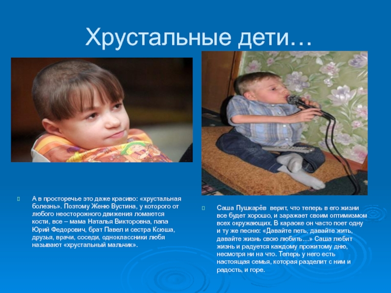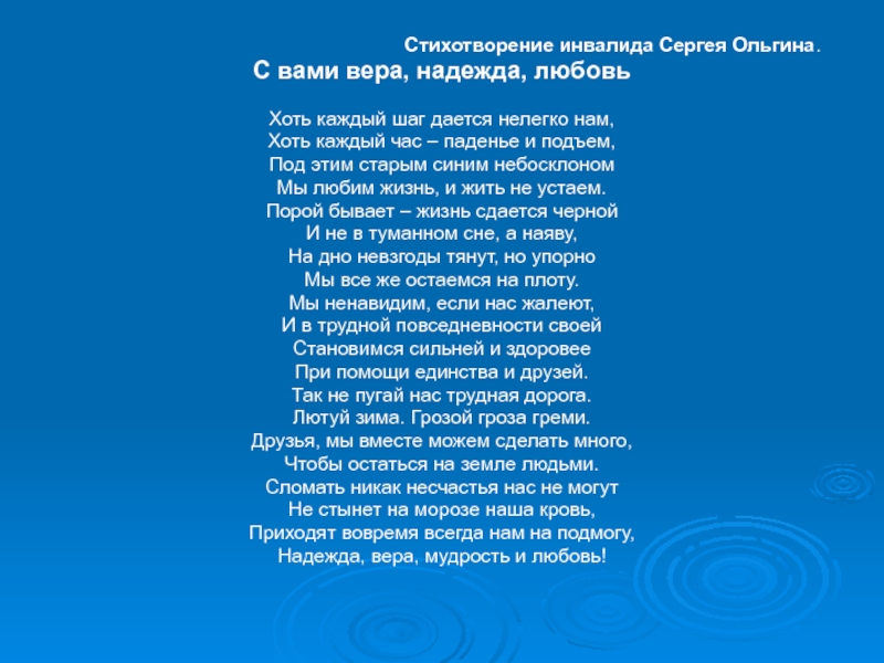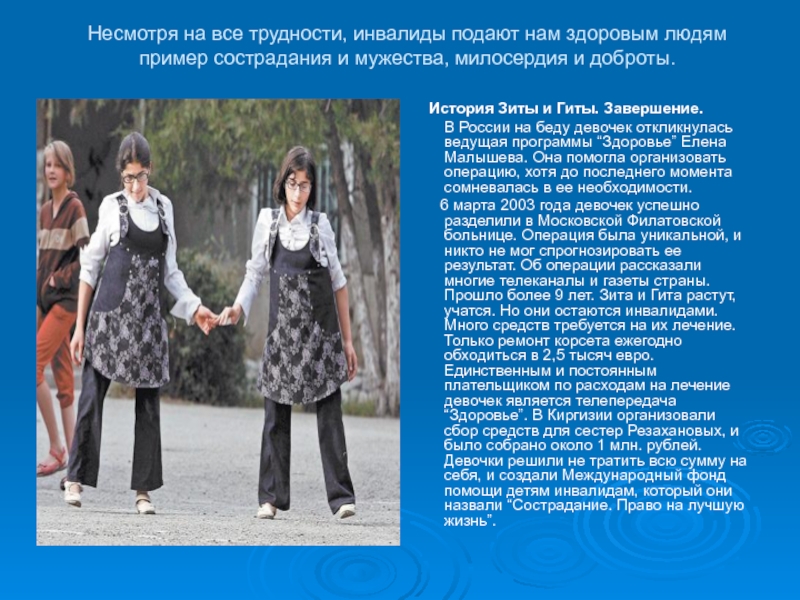 Игнорируя жестокие удары судьбы и слабое здоровье, они продолжают бороться и активно жить, доказывая всем, что истинная сила человека в его духе и силе воли, твёрдости характера и непоколебимости веры в лучшее.
