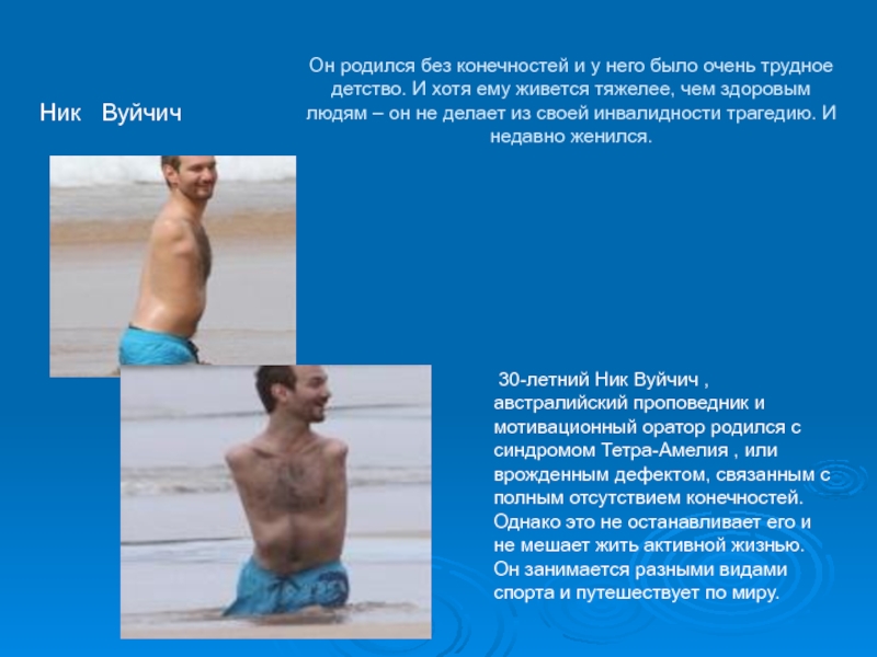 30-летний Ник Вуйчич , австралийский проповедник и мотивационный оратор родился с синдромом Тетра-Амелия , или врожденным дефектом, связанным с полным отсутствием конечностей. Однако это не останавливает его и не мешает жить активной жизнью. Он занимается разными видами спорта и путешествует по миру.