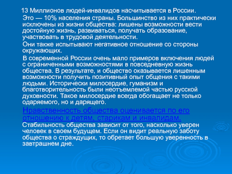 В современной России очень мало примеров включения людей с ограниченными возможностями в повседневную жизнь общества. В результате, и общество оказывается лишенным возможности получить позитивный опыт общения с такими людьми. Исторически милосердие, гуманизм и благотворительность были неотъемлемой частью русской духовности. Такое милосердие всегда обогащает не только одаряемого, но и дарящего.