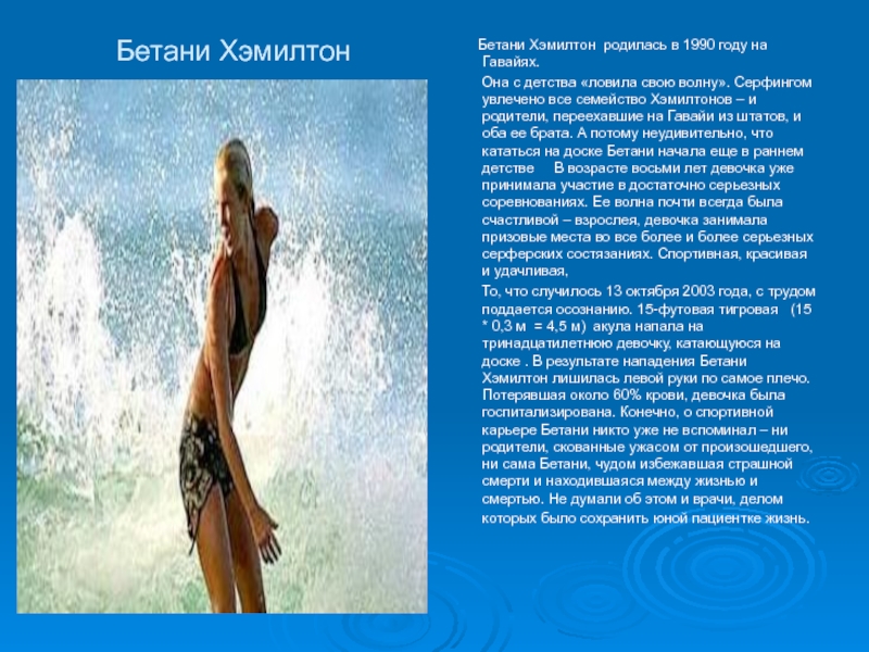 То, что случилось 13 октября 2003 года, с трудом поддается осознанию. 15-футовая тигровая (15 * 0,3 м = 4,5 м) акула напала на тринадцатилетнюю девочку, катающуюся на доске . В результате нападения Бетани Хэмилтон лишилась левой руки по самое плечо. Потерявшая около 60% крови, девочка была госпитализирована. Конечно, о спортивной карьере Бетани никто уже не вспоминал – ни родители, скованные ужасом от произошедшего, ни сама Бетани, чудом избежавшая страшной смерти и находившаяся между жизнью и смертью. Не думали об этом и врачи, делом которых было сохранить юной пациентке жизнь.