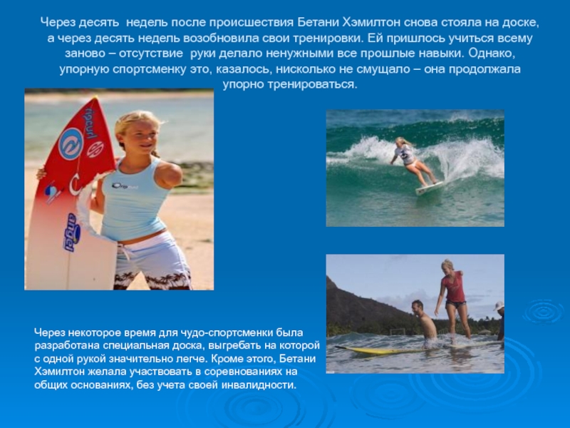 Слайд 46Через десять недель после происшествия Бетани Хэмилтон снова стояла на доске,