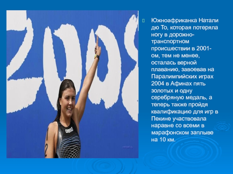 Слайд 56Южноафриканка Натали дю То, которая потеряла ногу в дорожно-транспортном происшествии в
