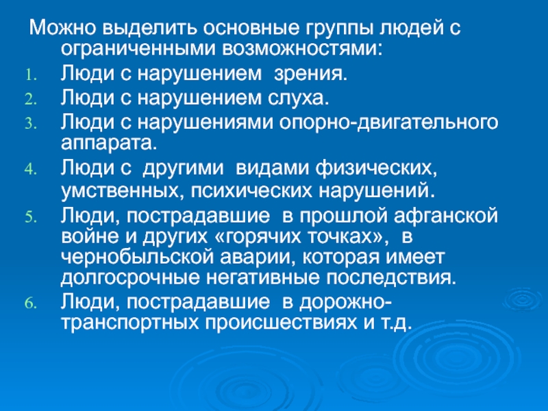 Слайд 10Можно выделить основные группы людей с ограниченными возможностями: