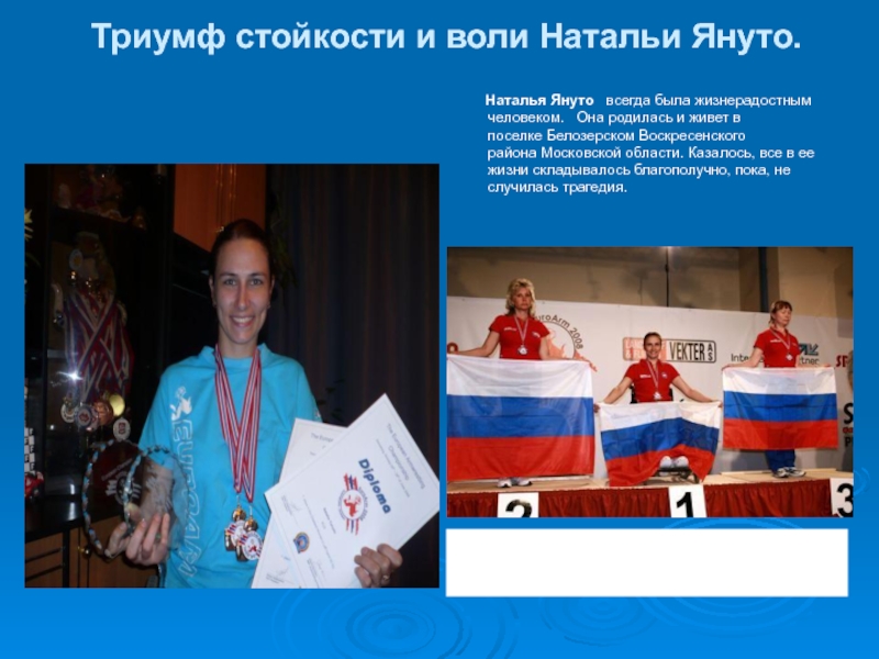 Слайд 44Триумф стойкости и воли Натальи Януто.