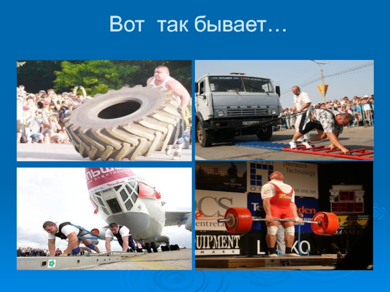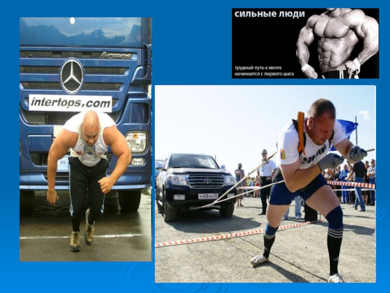 физической силой. Накачанные мышцы удивляют окружающих. Бицепсы и трицепсы восхищают мальчишек и им непременно хочется накачать такие же мускулы. Конечно здорово. Этим людям под силу не только гири, они могут прокатить по дороге настоящий автомобиль!