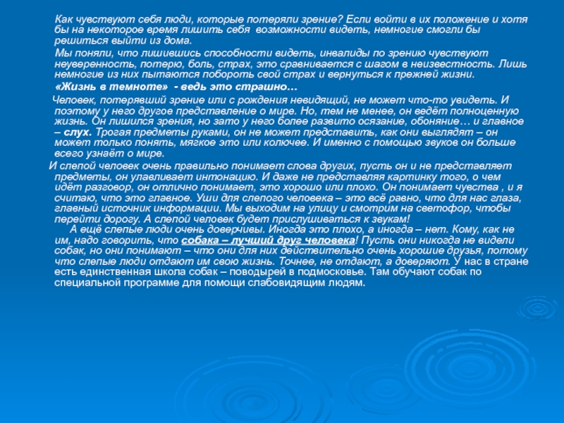 А ещё слепые люди очень доверчивы. Иногда это плохо, а иногда – нет. Кому, как не им, надо говорить, что собака – лучший друг человека! Пусть они никогда не видели собак, но они понимают – что они для них действительно очень хорошие друзья, потому что слепые люди отдают им свою жизнь. Точнее, не отдают, а доверяют. У нас в стране есть единственная школа собак – поводырей в подмосковье. Там обучают собак по специальной программе для помощи слабовидящим людям.
