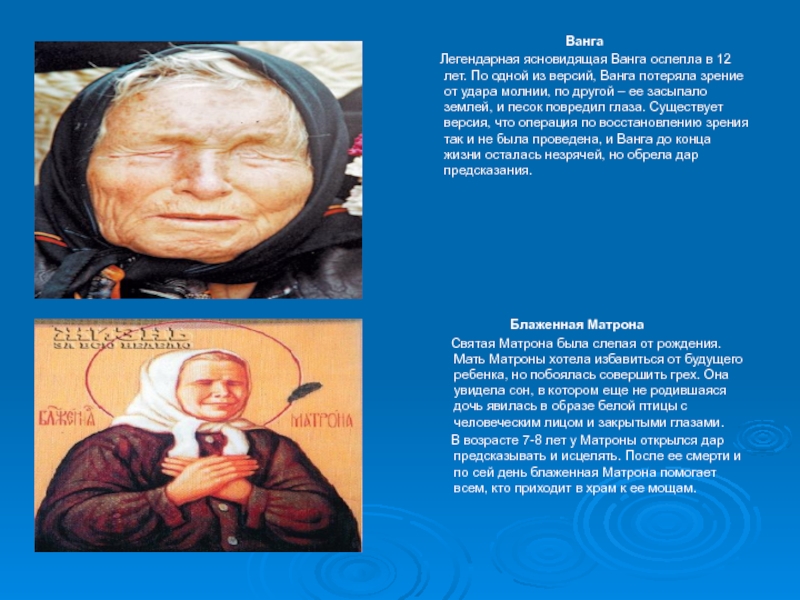 Легендарная ясновидящая Ванга ослепла в 12 лет. По одной из версий, Ванга потеряла зрение от удара молнии, по другой – ее засыпало землей, и песок повредил глаза. Существует версия, что операция по восстановлению зрения так и не была проведена, и Ванга до конца жизни осталась незрячей, но обрела дар предсказания.