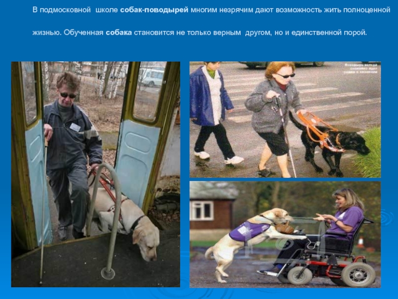 Слайд 12В подмосковной школе собак-поводырей многим незрячим дают возможность жить полноценной жизнью. Обученная собака становится не только