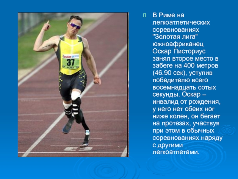 Слайд 59В Риме на легкоатлетических соревнованиях "Золотая лига" южноафриканец Оскар Писториус занял